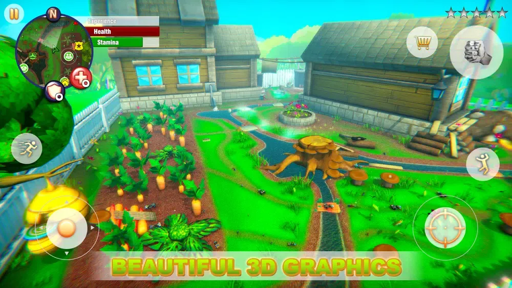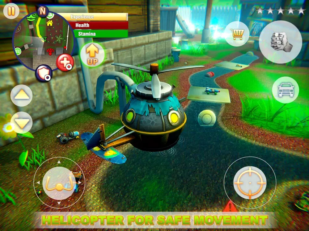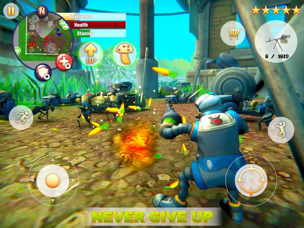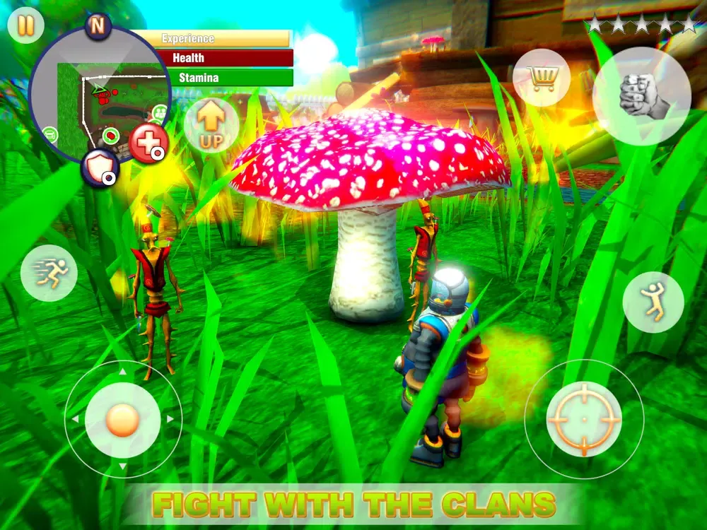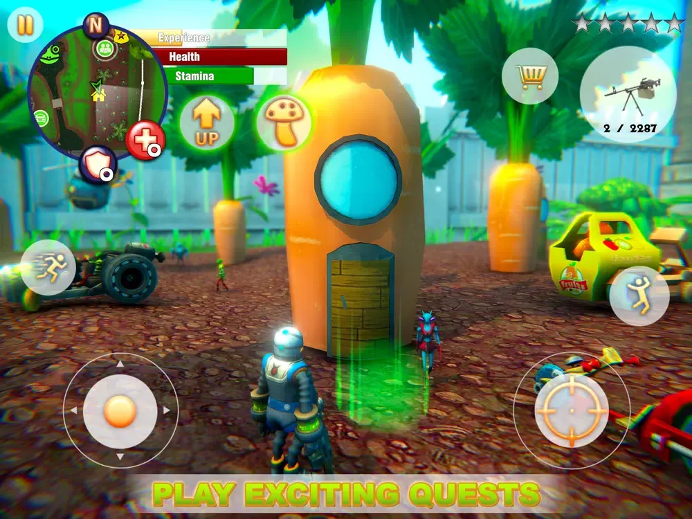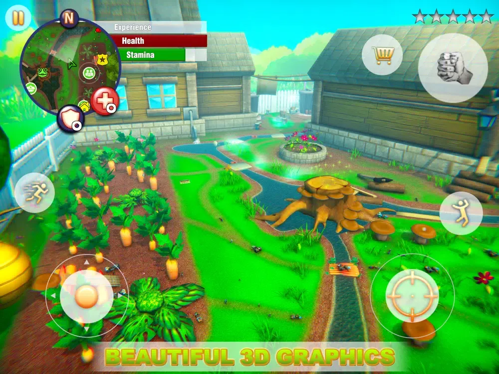 In this funny world you can freely roam the territory and explore all interesting features of the location. In this cartoon world lives a huge number of your rivals. You have to fight with ants, wasps, stick insects, horned beetles and cockroaches.