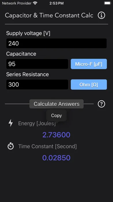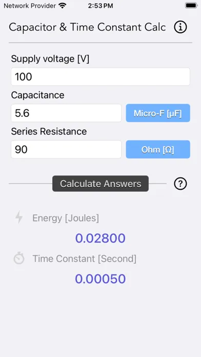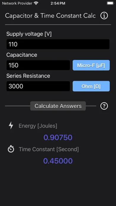 To calculate the energy (E) and time constant (RC) in a capacitor for the given voltage across it, we need two different values from the calculator: