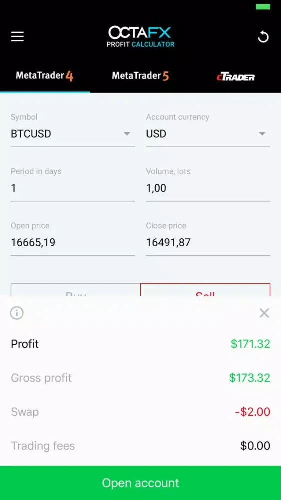 The OctaFX profit calculator is a simple tool to assist Forex investors in placing buy or sell orders. Simply select the currency pair and volume you want to trade, the direction you want to trade in and toggle the open and close price to calculate your profit potential. Use the profit calculator to work out the profits you could make using MetaTrader4, MetaTrader5, and cTrader.