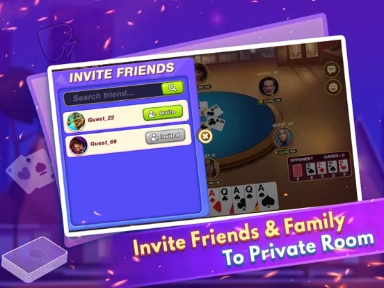 - The Player can select any boot amount as entry fees to play the table, and send table / room code invitation to other members via share features.