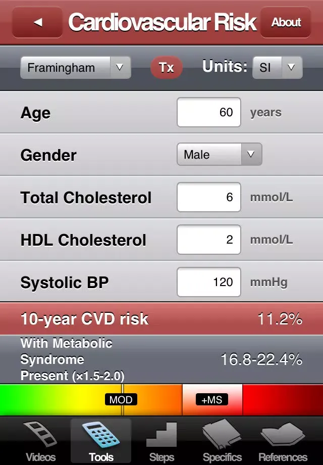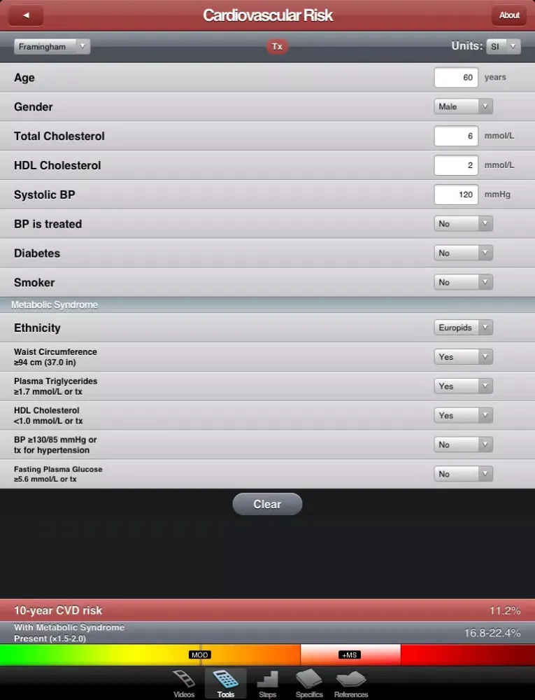 • CVD Risk calculator including Framingham and Reynolds risk score calculators, metabolic syndrome, and treatment targets.