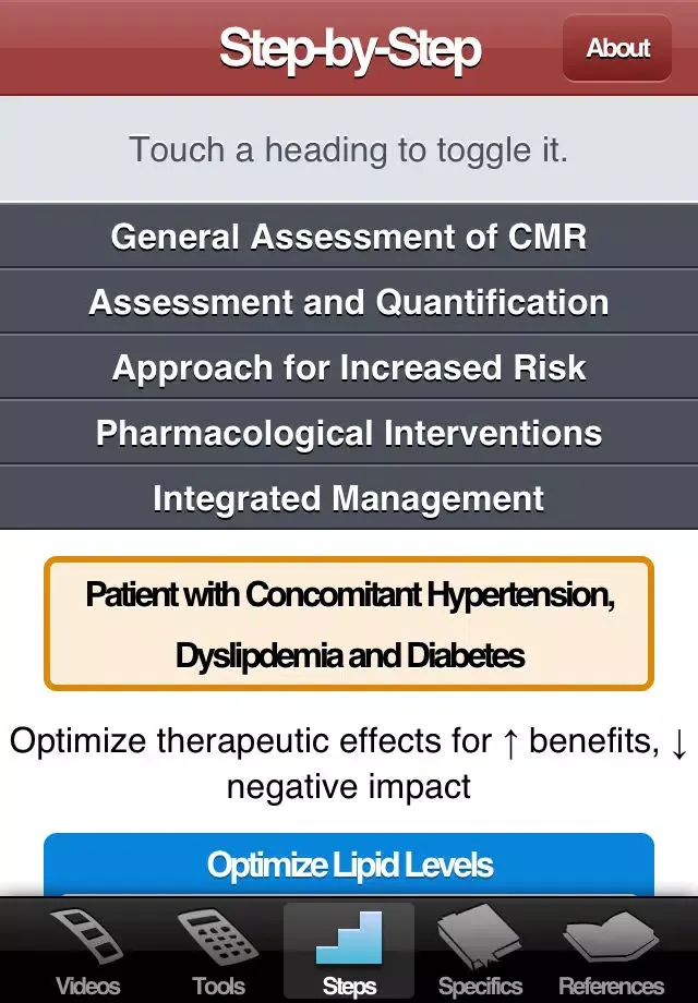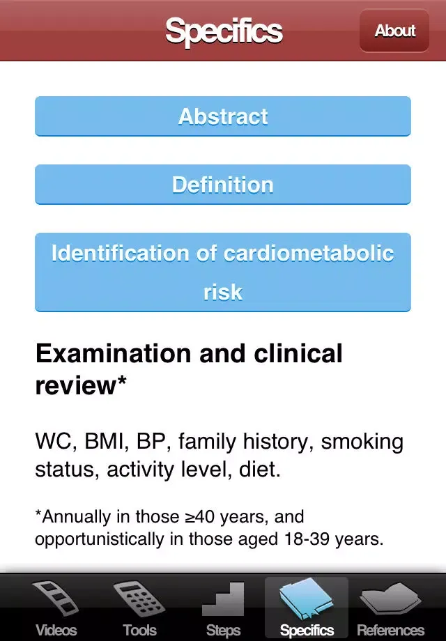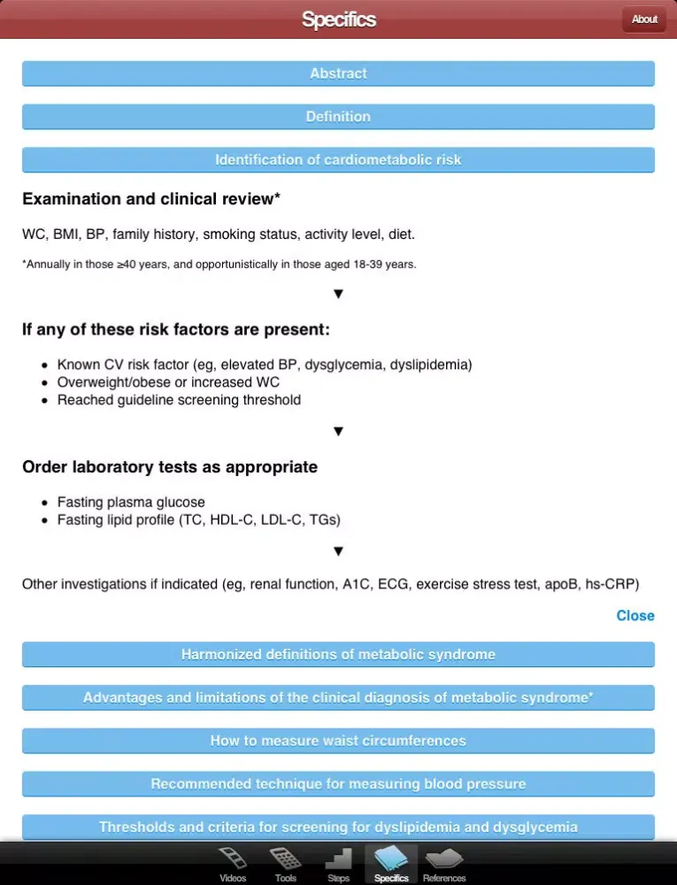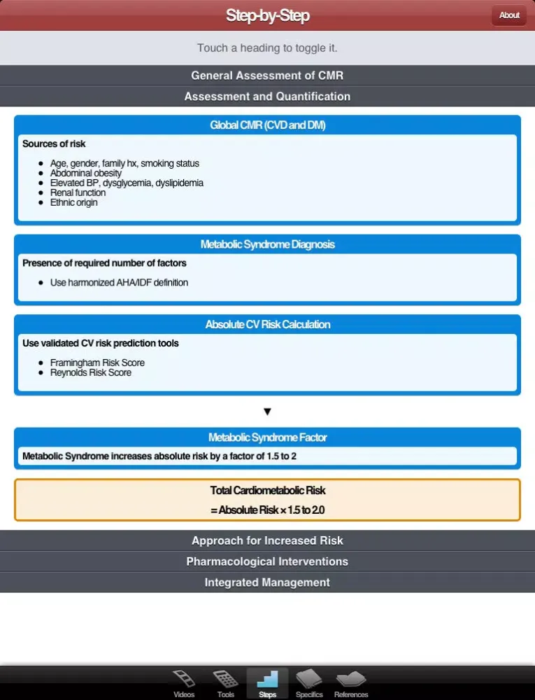 The CMR App is an official tool developed by the Canadian Cardiometabolic Risk Working Group to provide a clear and concise summary of the "Identification and Management of Cardiometabolic Risk in Canada" position paper published in March 2011 in the Canadian Journal of Cardiology. It is available in both English and French.