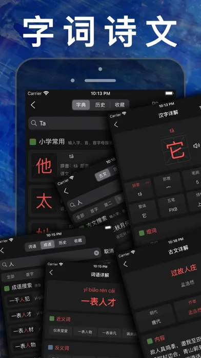 3、汉语字典、拼音、笔画、边旁部首搜索功能;