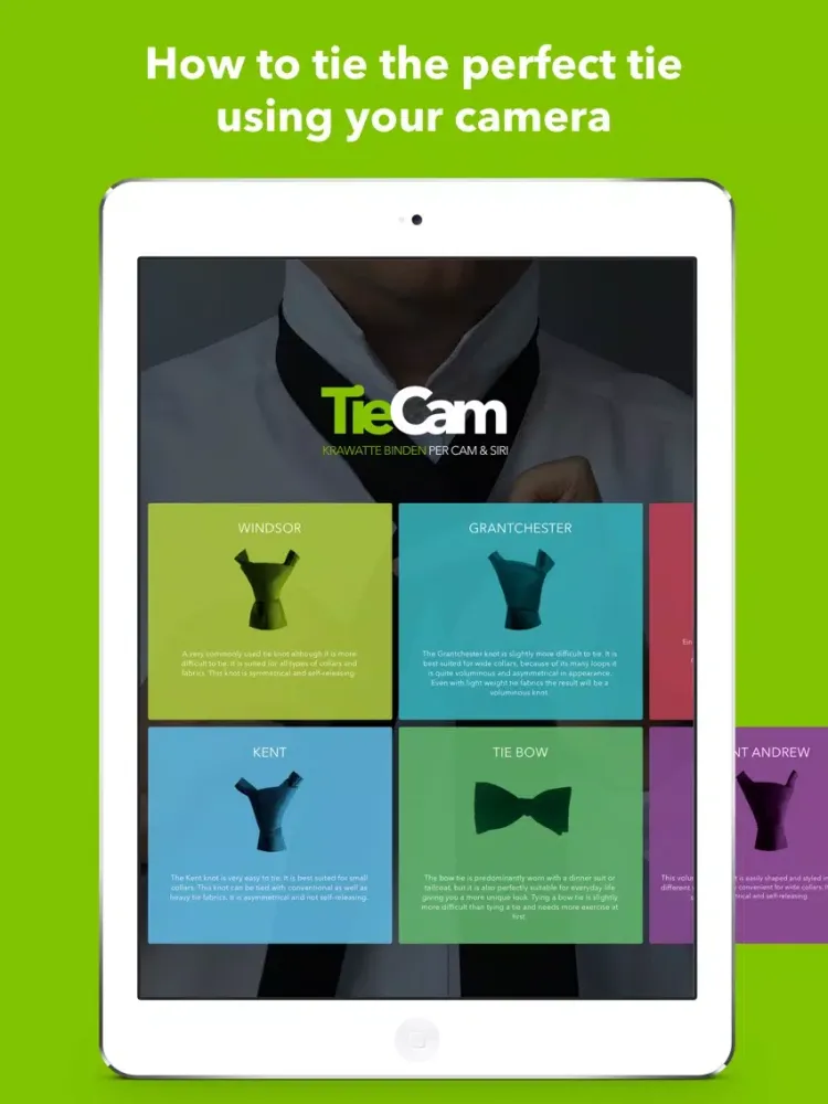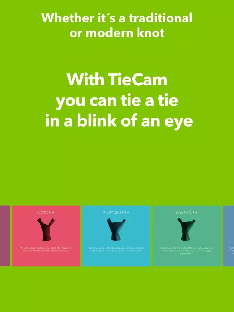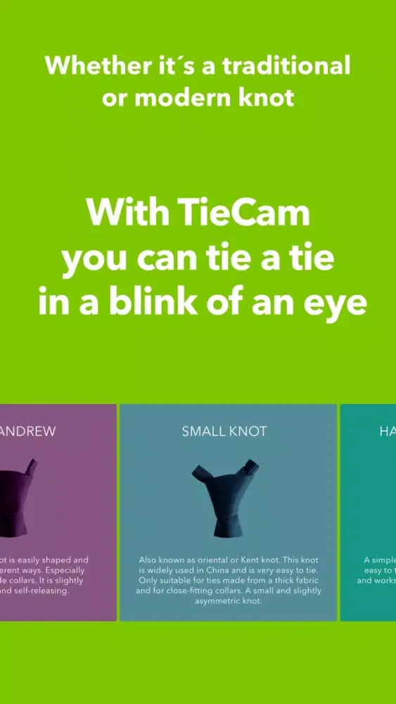 Using the front camera of your device, TieCam makes it really easy to tie a tie. With TieCam you can see directly in your reflection how to tie the perfect tie knot. All you have to do is to bring yourself into the right position and follow the instruction which TieCam will give you.