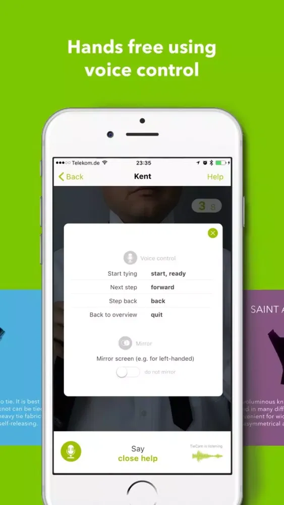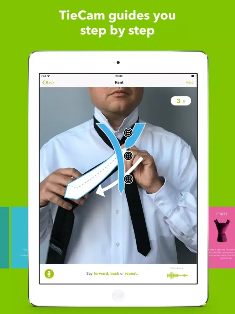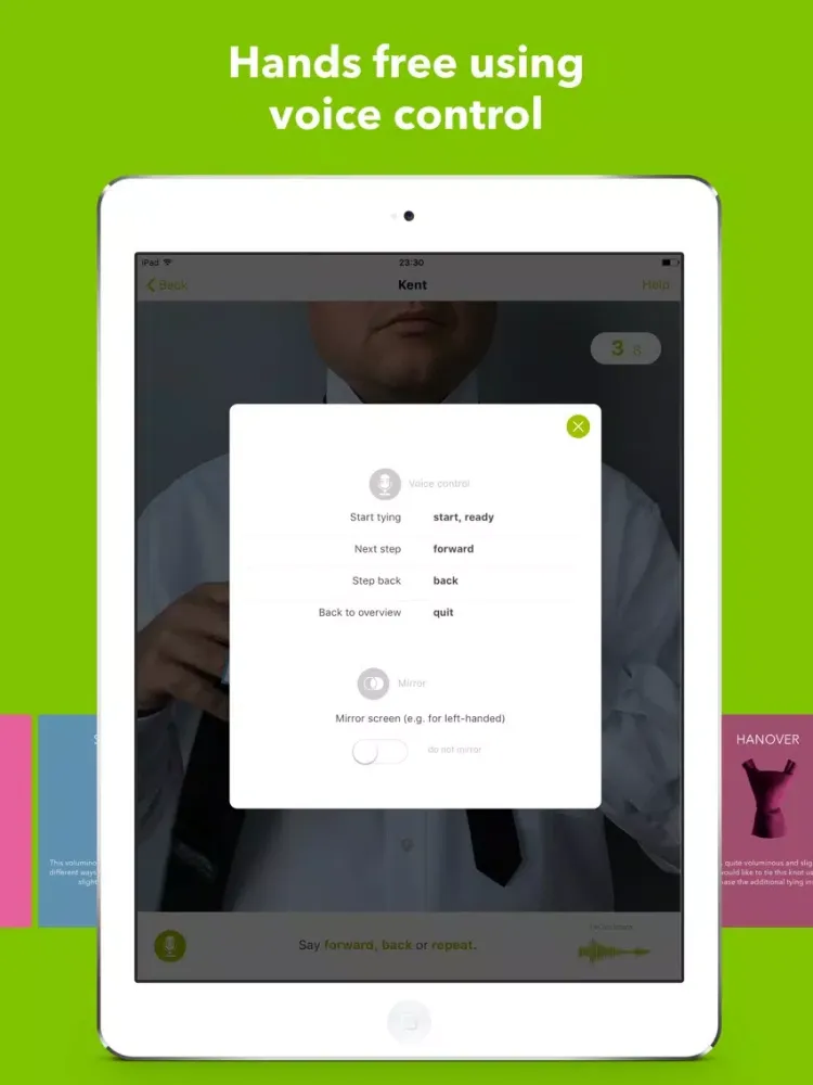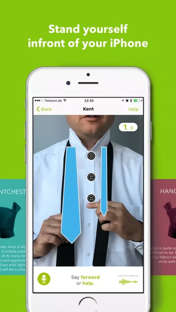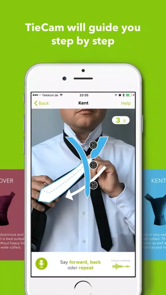 You can control TieCam by speech recognition in order to have both hands free while you tie the tie. If you are ready for the next sub-step, then just say 'next' and TieCam will proceed. Alternatively you can control TieCam manually by swiping horizontally over the tie image.