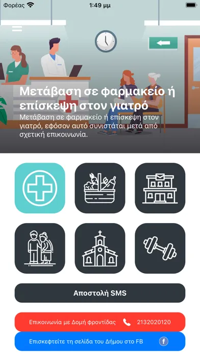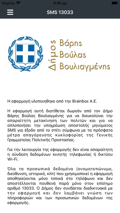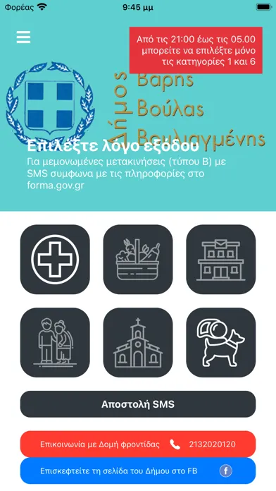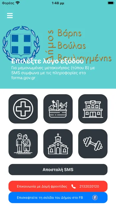 Η εφαρμογή αυτή διατίθεται δωρεάν από τον Δήμο Βάρης Βούλας Βουλιαγμένης για να διευκολύνει την απαραίτητη μετακίνηση των πολιτών και για να απλοποιήσει την υποχρέωση αποστολής μηνύματος SMS για έξοδο από το σπίτι σύμφωνα με τα πρόσφατα μέτρα απαγόρευσης κυκλοφορίας της Γενικής Γραμματείας Πολιτικής Προστασίας.