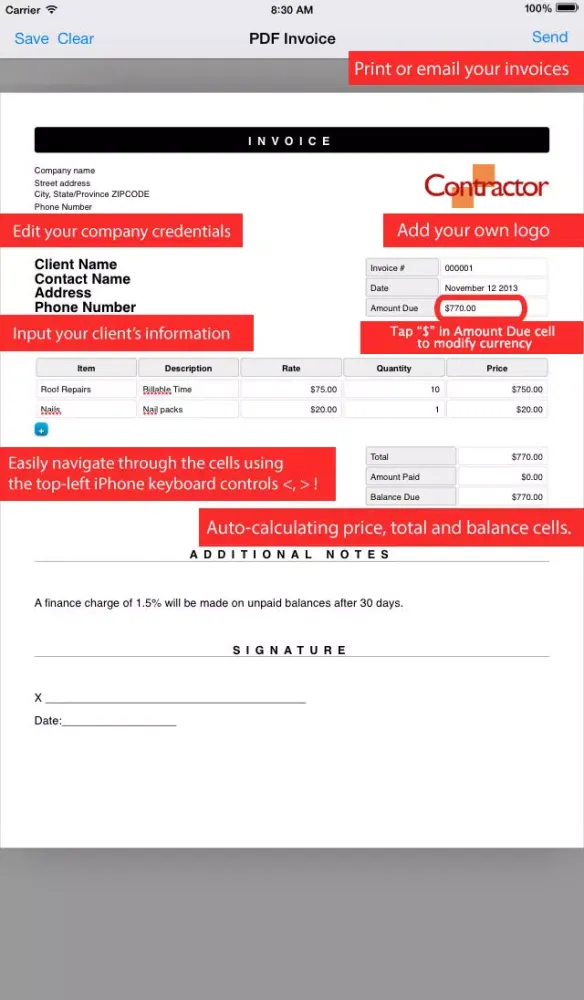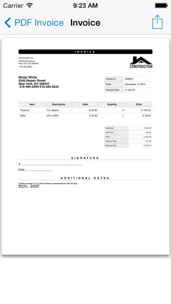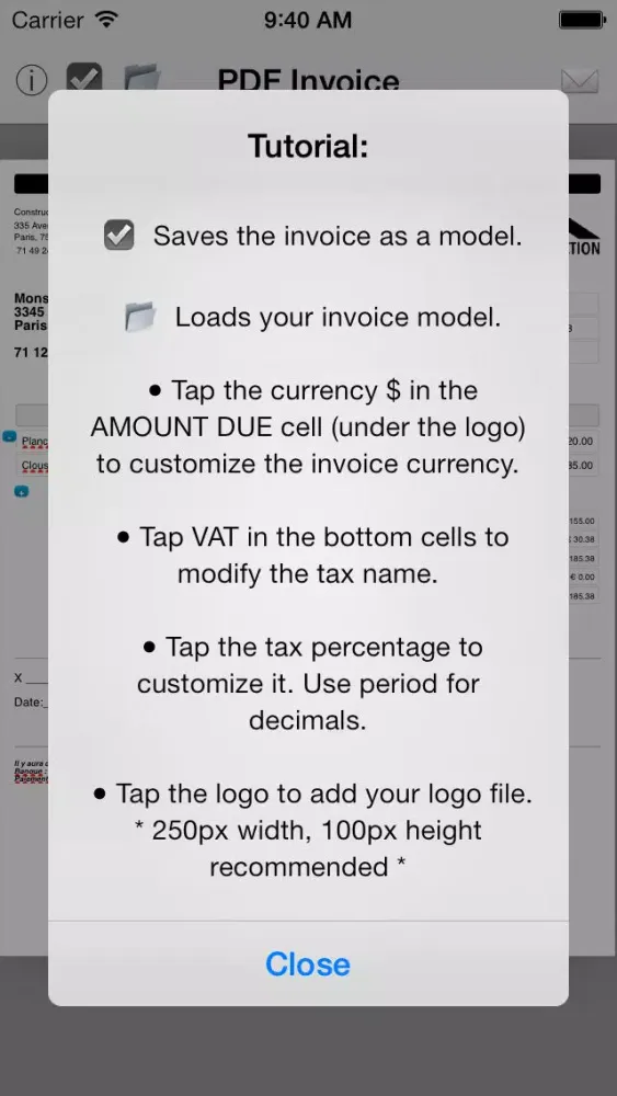 Simply add your name, address, phone number and logo and adjust to invoice to your taste. Tap the checkmark and the app will present you with the result every time you hit the file button.
