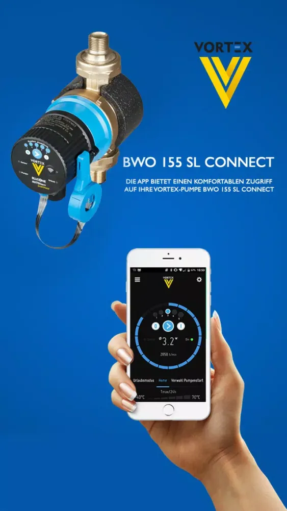 bietet einen komfortablen Zugriff auf Ihre Vortex AUTO learn-Pumpe BWO 155 SL Connect. Über die App können Sie Interaktionen zur Veränderung des Pumpenmodus‘ durchführen sowie vielfältige Informationen zur Pumpe abrufen. Ein WiFi-Sendemodul ist bereits in diese Pumpe integriert. Externe Server, Router oder sonstige Hardware sind nicht erforderlich!