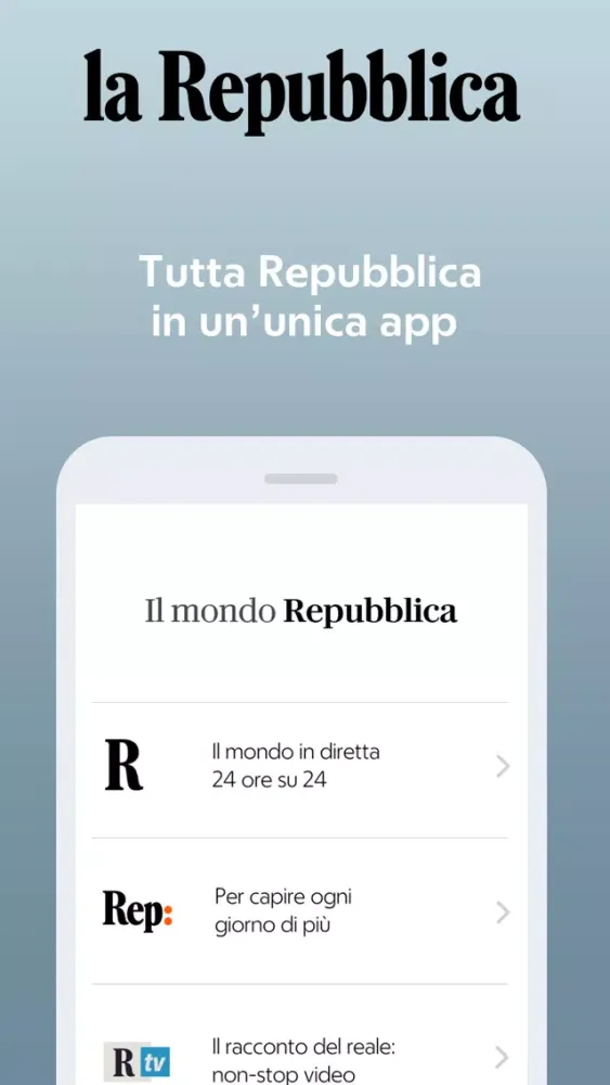 La nuova applicazione di Repubblica offre le notizie in tempo reale di Repubblica, tutti i video di RepTV, gli approfondimenti di Rep: e la prima pagina del quotidiano da Repubblica+.