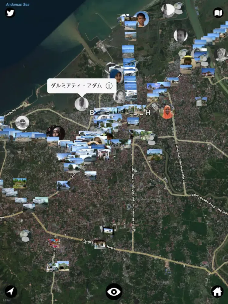 "Aceh Tsunami Archive" was constructed with the same system design as our past Archives Series. Pluralistic data of the Indian Ocean Tsunami are plotted on a 3D digital globe. Users can look through all the data, flying-over in the sky in Banda Aceh reproduced on the digital globe with using zoom-in-out and pan operation.