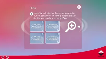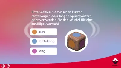 Zum Spielverlauf: Aus jeweils vier Vorschlägen ist das korrekte Sprichwort auszuwählen. Die Wahl zwischen kurzen, mittellangen oder langen Sprichworten beeinflusst den Schwierigkeitsgrad. Ein 50:50-Joker bietet zusätzliche Hilfe und bringt Spaß ins Spiel.