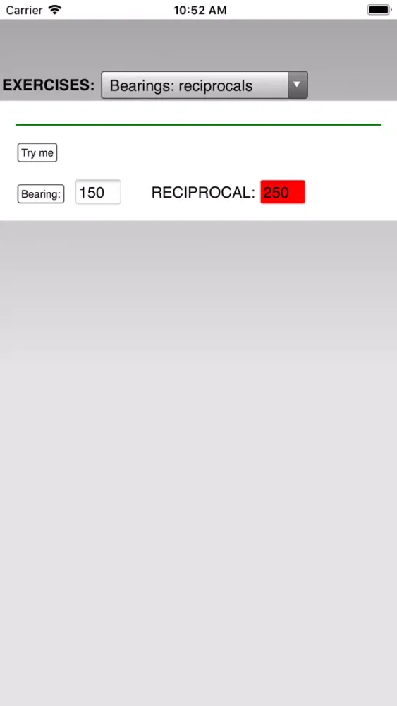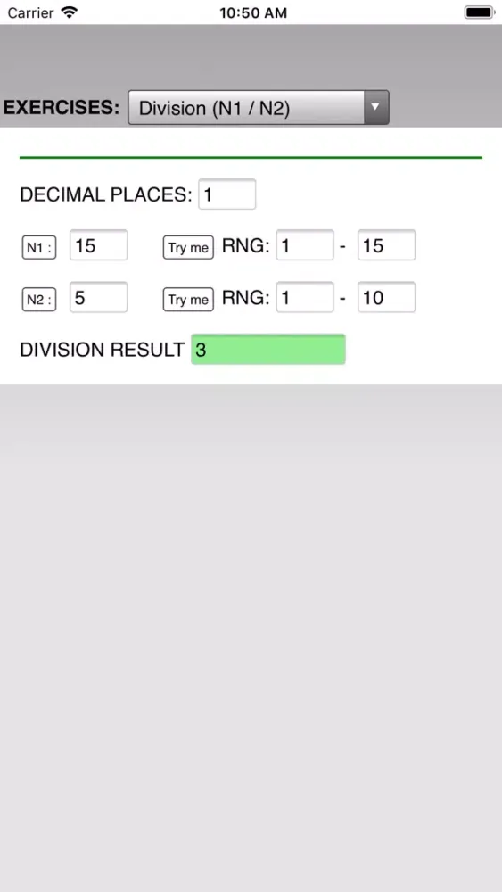 A 'try me' button generates random problems. The entered solutions are checked and a correct/wrong indication is provided.