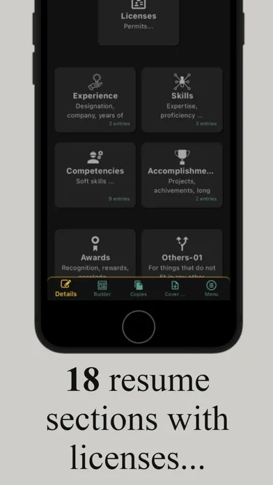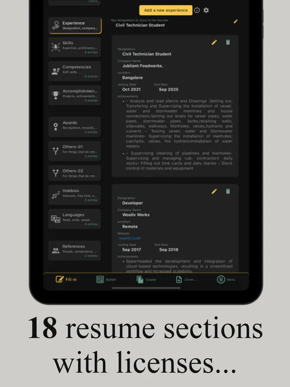 There are 02 main tabs in the app, one in Fill-in and the other is Builder. The Fill-in tab is where you enter your resume details and the Builder tab is where you customize & download the resume in PDF format.