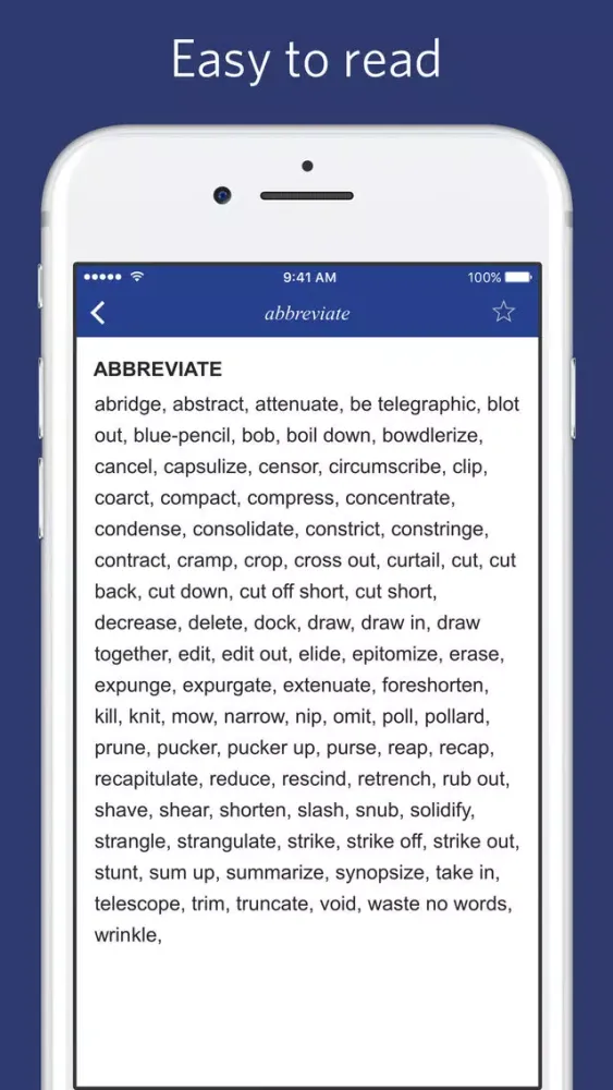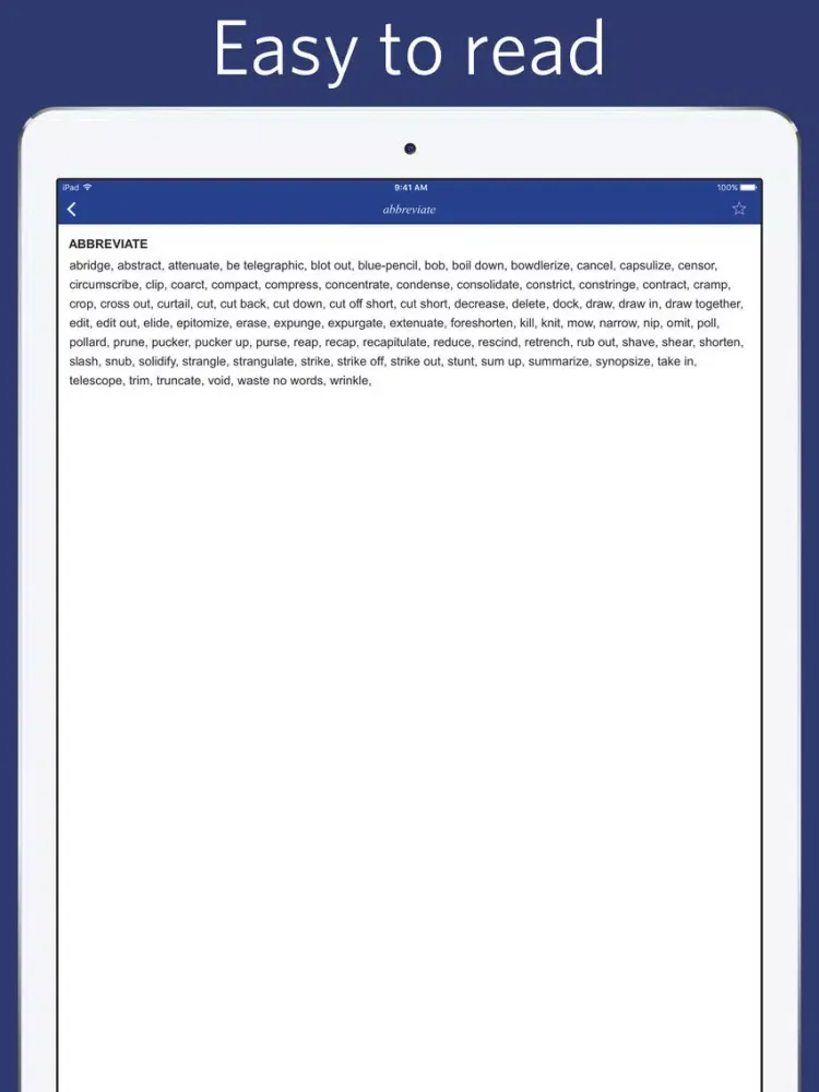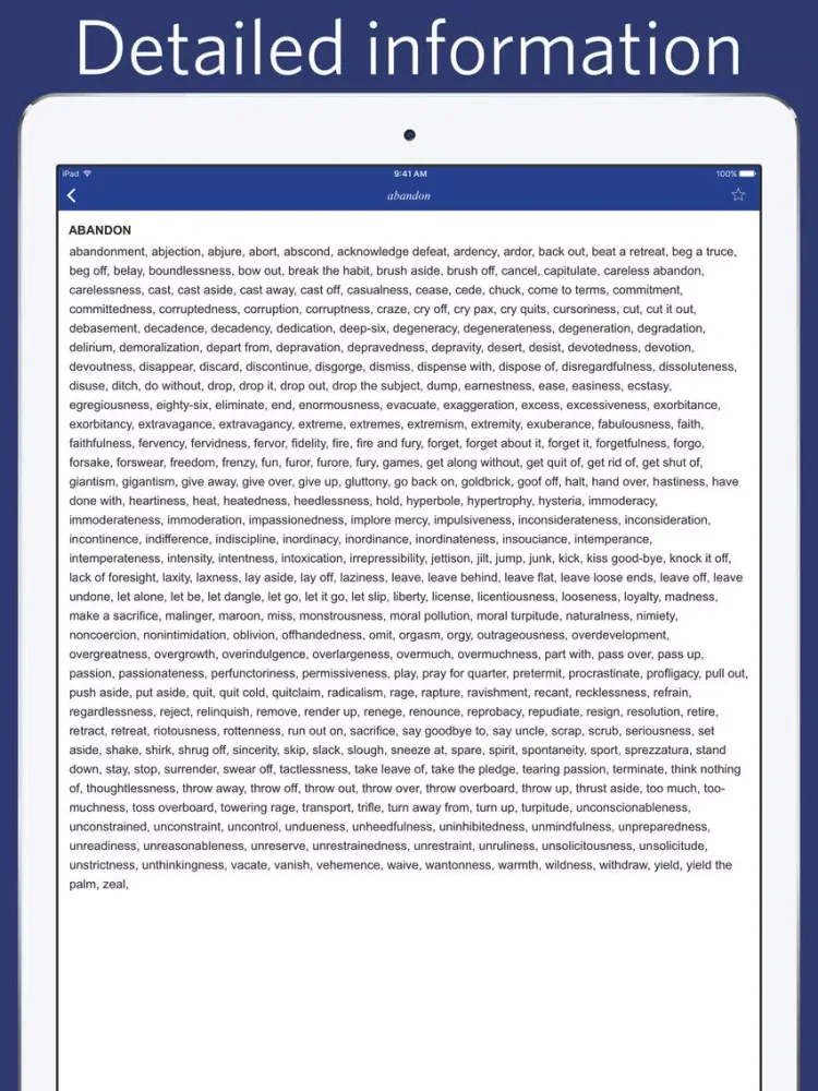 The Moby Thesaurus contains 30,260 words, with 2,520,264 synonyms and related terms – an average of 83.3 per root word. Each line consists of a list of comma-separated values, with the first term being the root word, and all following words being related terms.