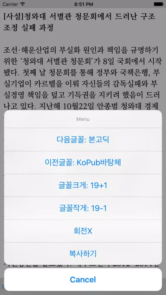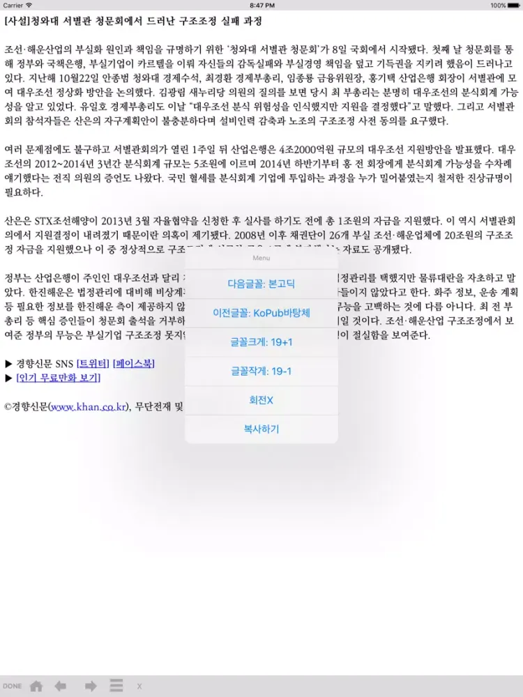 신문기사, 사설, 칼럼, 웹소설 등을 예쁜 한글 글꼴로 편안하게 즐겨 보세요!