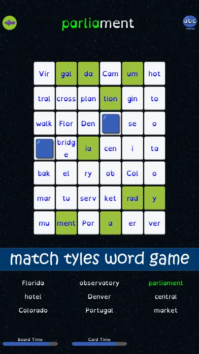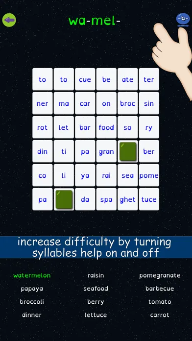 Syllable Word Search uses a unique memory card game and word search style game, that challenges players to form words by searching for syllables. Each of the 27 levels in Syllable Word Search provides increasing challenges to players.