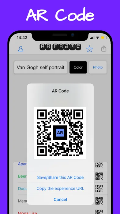 Developed in partnership with the AR Code service, the app enables you to generate Augmented Reality Codes for each of your creations. These codes allow you to easily share your AR Frame creations or anchor them in places of your choice, such as rooms, showcases, or products.
