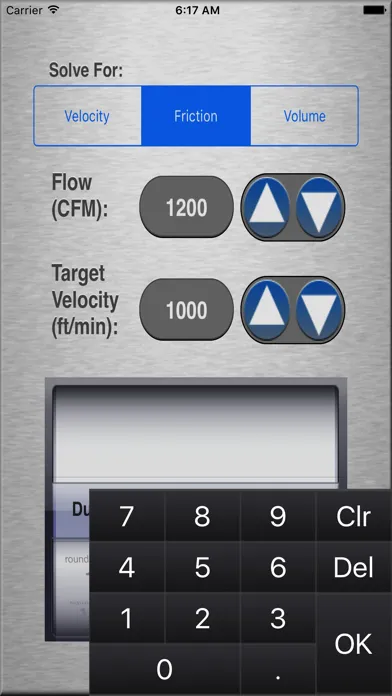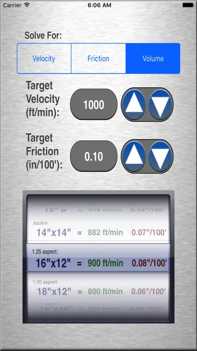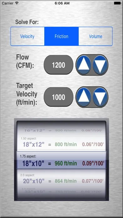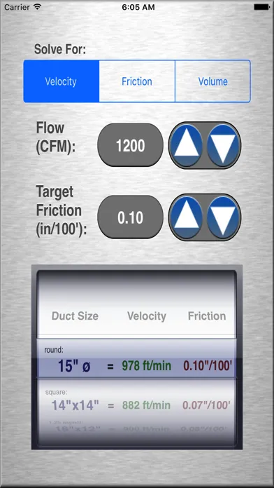 The app goes beyond simply calculating velocity, friction, or volume; It also offers a list of every even sized duct that meet the design criteria for the user to review and consideration at various aspect ratios.