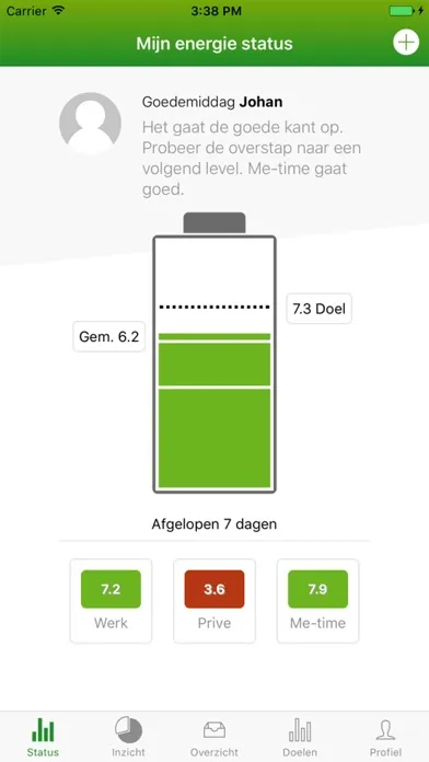 Dagelijks kan de gebruiker zijn energielevel bijhouden (voor werk, privé leven en zichzelf) en aangeven wat hem energie gegeven en gekost heeft die dag. Ook is er de mogelijkheid hieraan positieve en negatieve ervaringen, plus- en minpunten, te koppelen, die op volgende dagen hergebruikt of aangevuld kunnen worden. Hierdoor wordt er een historie aan data opgebouwd, waarmee de app de gebruiker een totaal overzicht geeft en trends in groen-oranje-rood kleurachtergrond zichtbaar zijn. Middels dit ‘stoplichtsysteem’ krijgt men inzicht of de persoonlijke batterij al of niet opgeladen wordt.