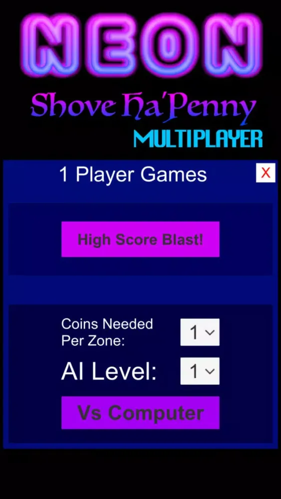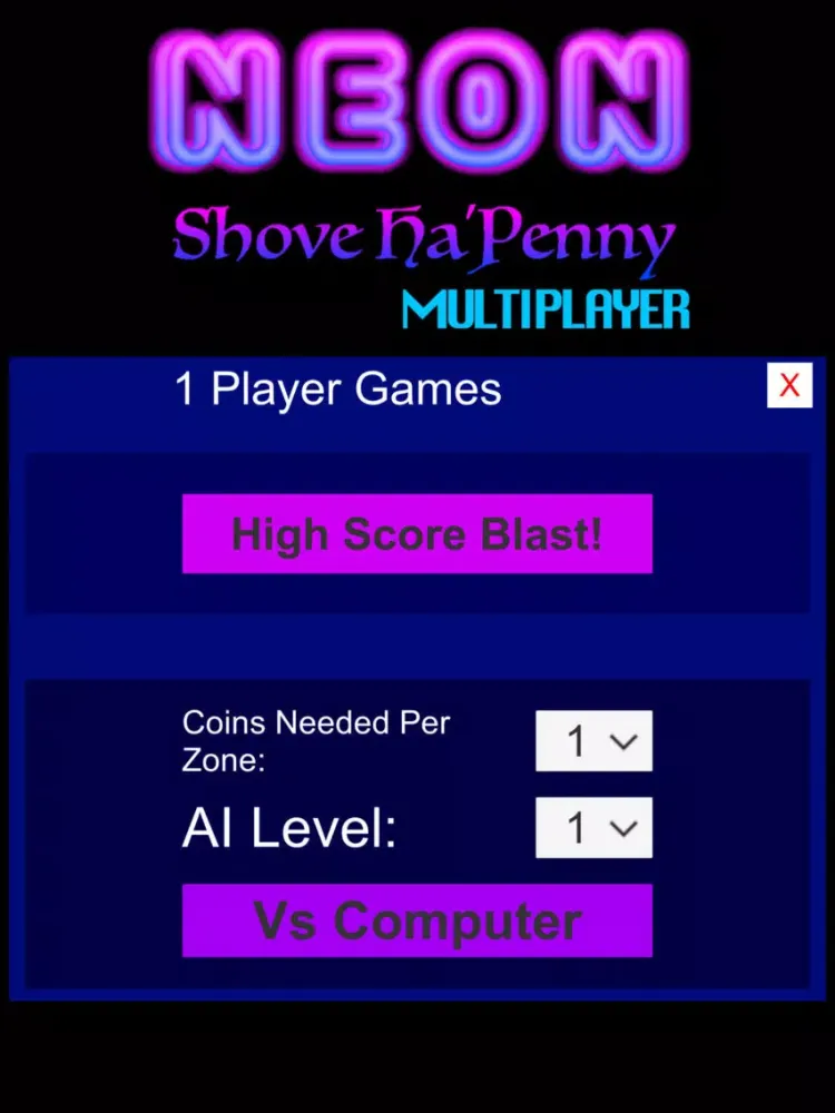 Shove Ha'penny is an old game of skill pub game where you push coins along a board and aim to get them in between the lines on the board to score. Some of the rules have been reimagined and simplified for the modern gaming era in Neon Shove Ha'penny Multiplayer, including a single player High Score Blast mode, where each scoring zone is worth points equal to the number of the zone, with 1 being the nearest and 9 being the farthest away. In High Score Blast mode, you need to score at least 10 points per round of 5 coins to continue to the next round.