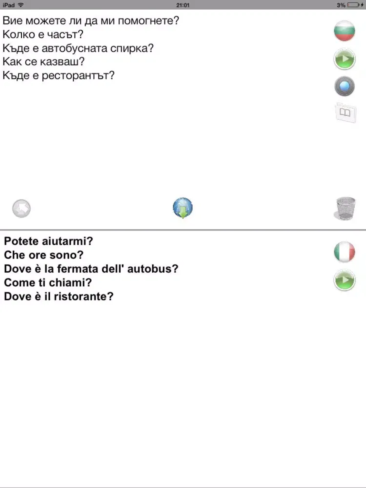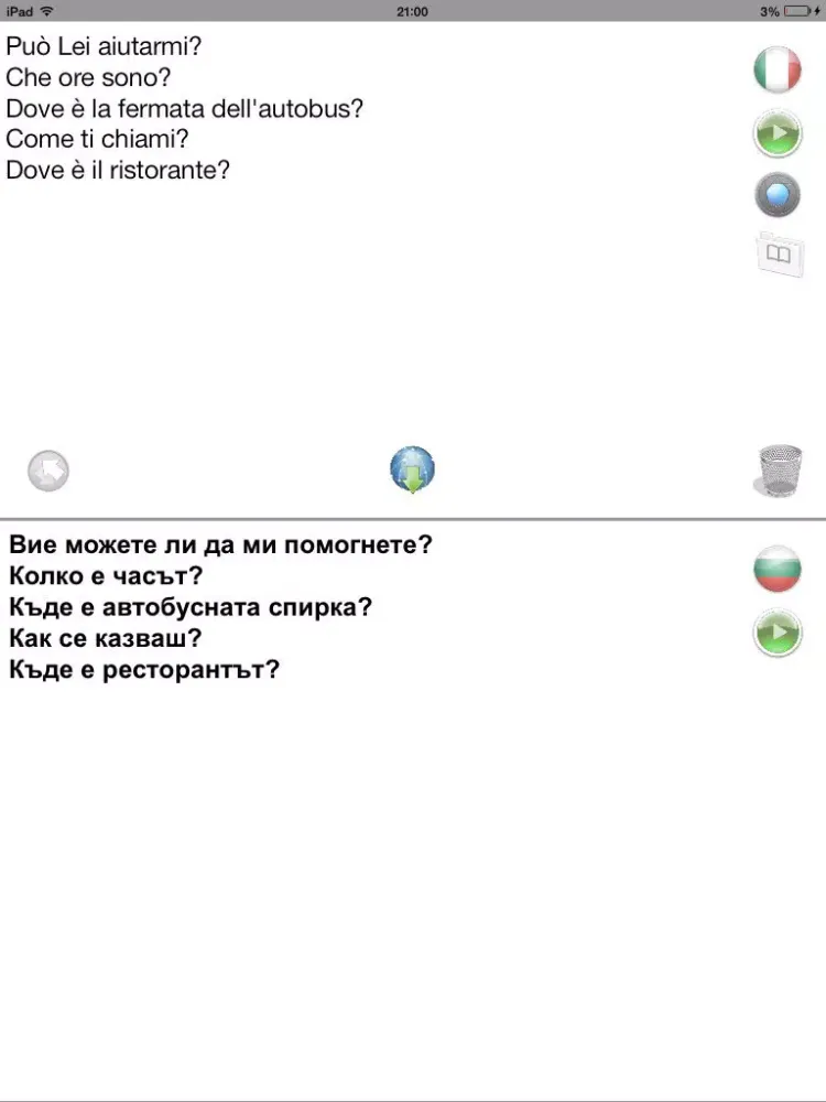 ОФЛАЙН преводач и речник -- безценен инструмент когато пътувате! Превежда текстове, думи и снимки от италиански на български и обратно без интернет/3G. Спестете от високите такси за роуминг.