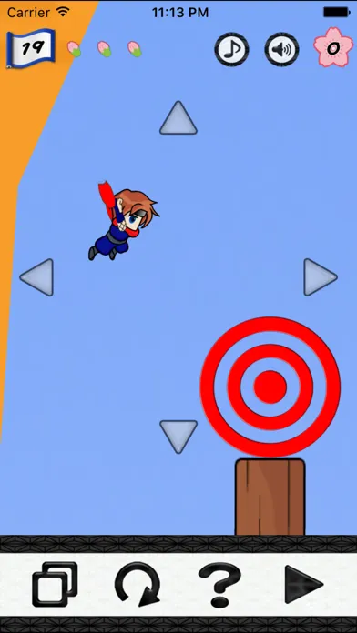 * When the ninja is spinning in midair, the spin will stop when you throw the grappling hook. And with a slight tap on the screen right after the throw, the ninja will pull back and restore the grappling hook. Using this movement allows you to face in any direction you want in midair.