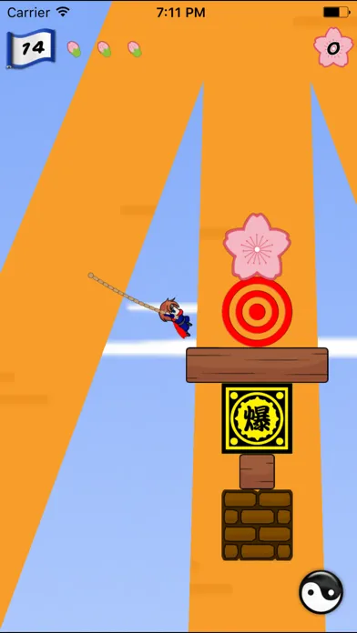 * The ninja will pull on the grappling line and will make a long jump with a long continuous touch on the screen, when the ninja is clinging to the grappling line.