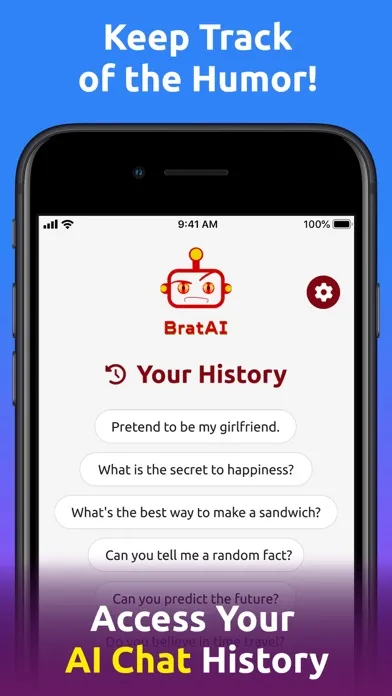 Moreover, BratAI conveniently stores your chat history, allowing you to revisit and relive those moments of laughter. Whether it's a funny joke, a clever pun, or a comical exchange, you can easily scroll through your chat history and reminisce about the hilarious moments shared with your friends. Relive the humor anytime, anywhere, and never miss a beat.