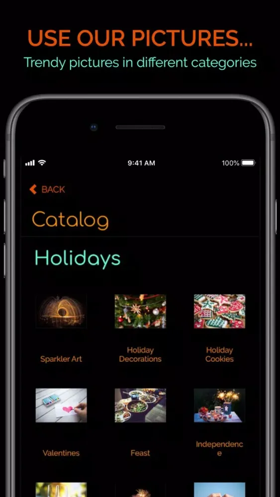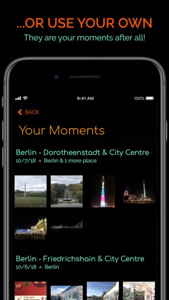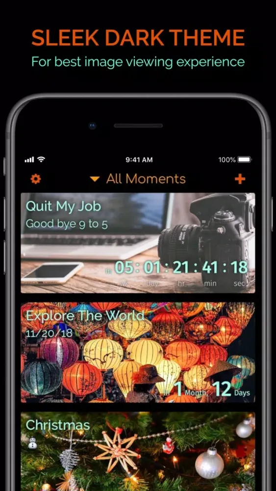 • Photos are the heart and soul of each moment. Choose from trendy app photos or use your own! The sleek dark theme is designed to bring the best out of each photo.