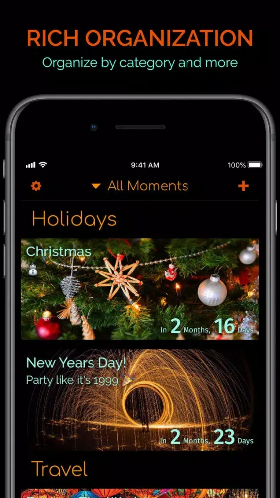• Multiple ways to organize your events: Easily switch between viewing upcoming, past, or all moments, and sort those moments by category or chronologically, ascending or descending.