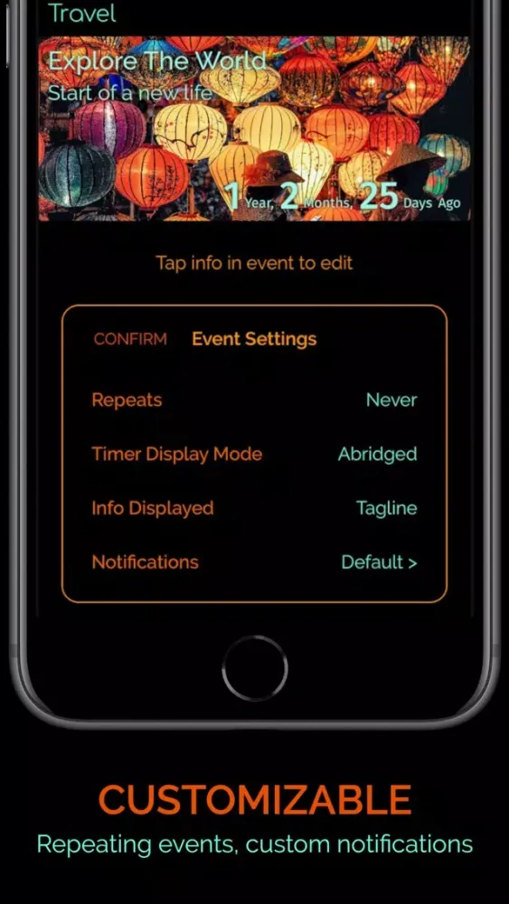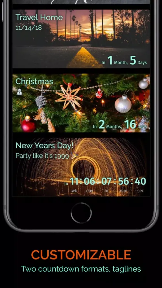 • Two countdown formats are available based on how precise you want to be. See how much time is left until or since your moment to the second, or for those big events that are months away you can choose to view a more broad countdown to the day.