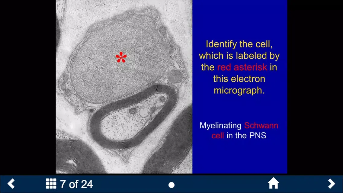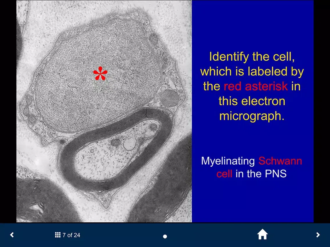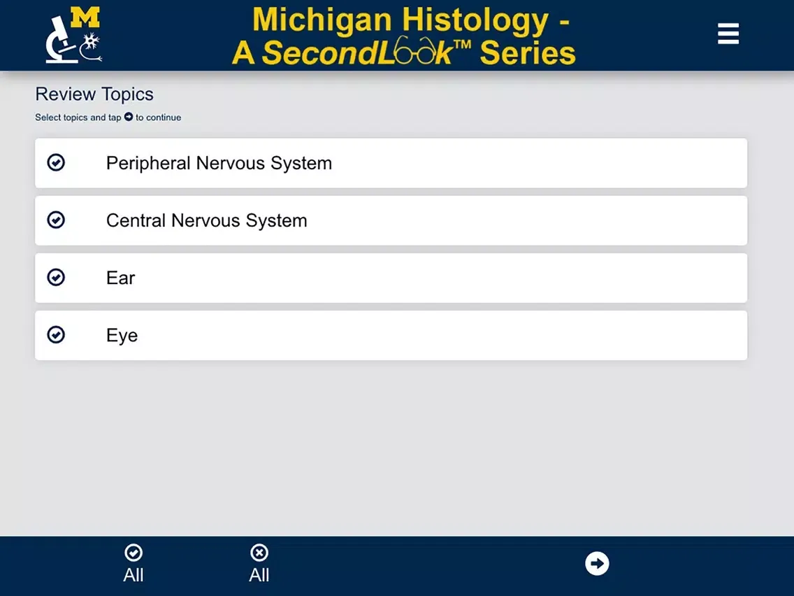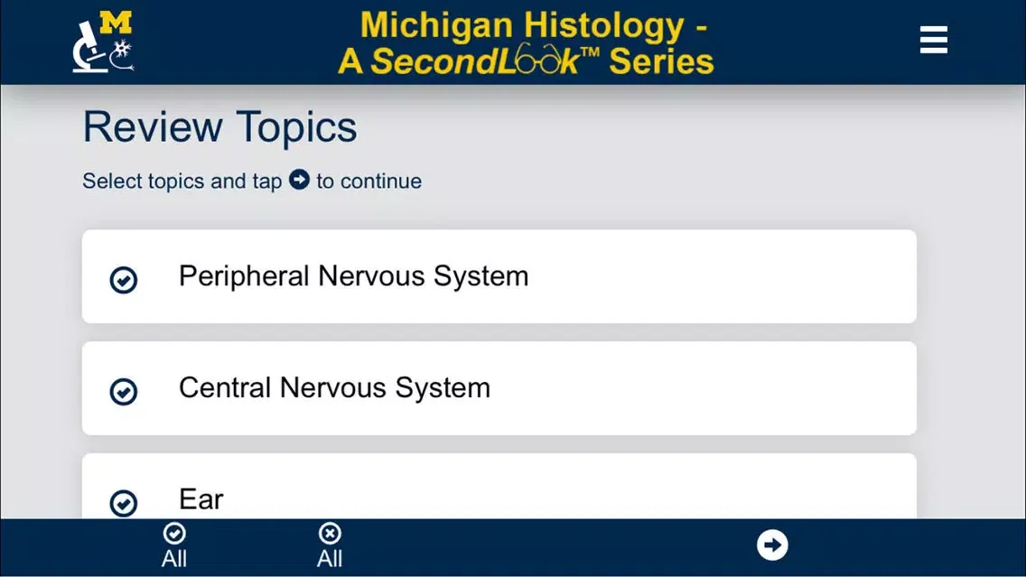 The NS Histology SecondLook™ mobile application is a study aid that provides a series of histology slides for users to self-test their level of knowledge and ability to recognize histological structures. It features high quality images from the University of Michigan Virtual Slide collection and contains 4 sets covering the peripheral and central nervous system, as well as eye and ear histology.
