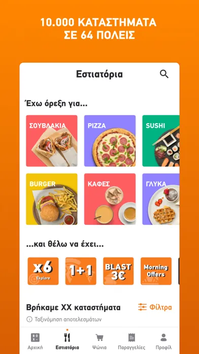 Και όλα αυτά μπορείς να τα βρεις σε περισσότερα από 10.000 καταστήματα σε 64 πόλεις πανελλαδικά (όπως καταστήματα φαγητού και καφέ, μαναβικής, κρεοπωλεία, ιχθυοπωλεία, delicatessen, κάβες, βιολογικά προϊόντα, ζαχαροπλαστεία) αλλά και στα σούπερ μάρκετ «Μασούτης» και «Κρητικός» με παράδοση ακόμα και αυθημερόν, σε τιμές και προσφορές που ισχύουν και στα φυσικά καταστήματα.