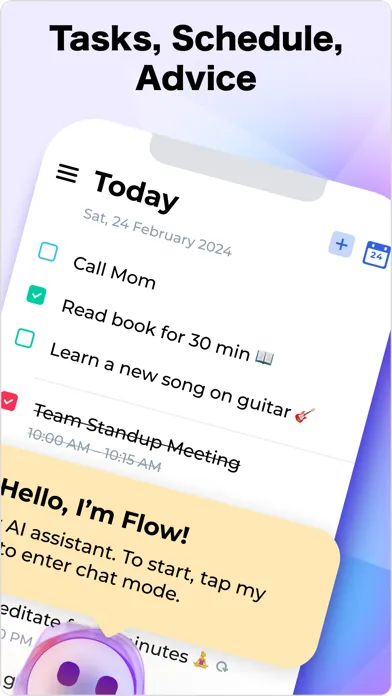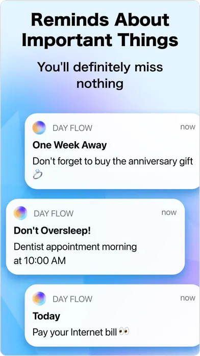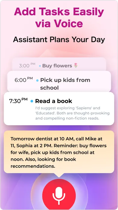 Day Flow is a game-changing daily planner. Instead of manually typing out your day's plan, just voice your tasks and plans for the day or week, and your schedule is ready in a snap. Just say something like: "Tomorrow dentist at 10AM. Call with Mike at 11 AM and Sophia at 2 PM. Gotta grab flowers for the wife. Daughter's school drop-off at 12PM, pick-up at 6PM. Oh, and find time for 15 minutes meditation." And voila, your assistant will arrange it all, keeping you on track all day.