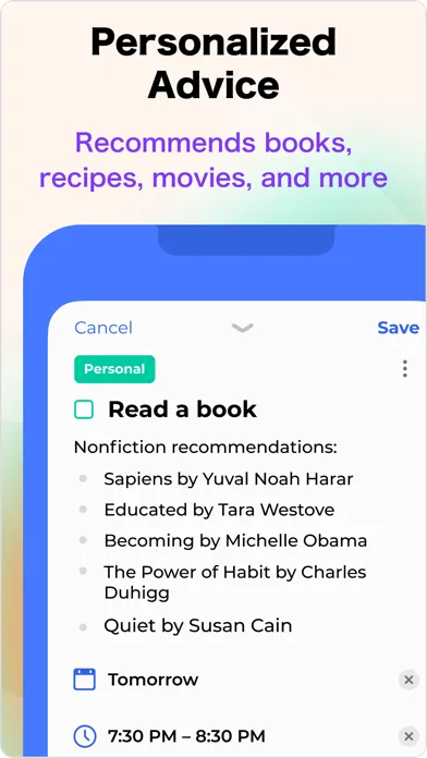 Dreaming of some downtime with a book but can't find the slot? Simply say: "Find me some time to relax with a book. Got any good non-fiction recommendations?" And just like that, your assistant will propose a suitable time and suggest a few intriguing non-fiction books. But it's not all about books. Whether you need suggestions for training plans, what to make for dinner, which movie to catch tonight, and much more, all at your request.