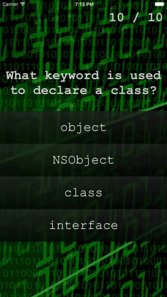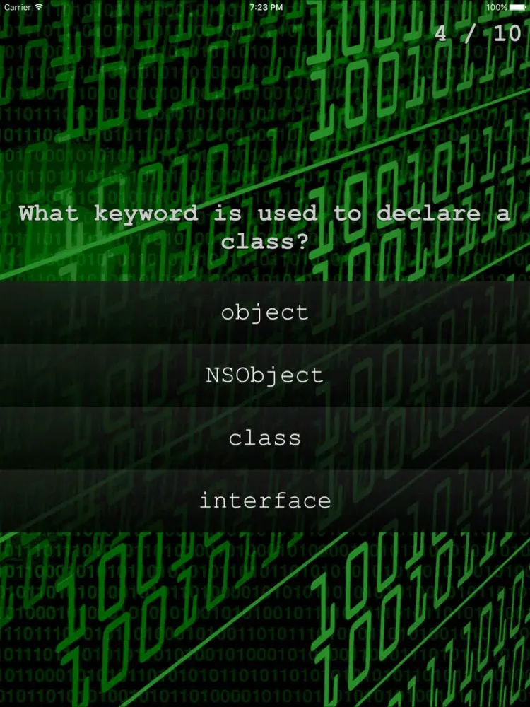 If you organize a job interview and want to hire a professional iOS developer, a list of questions covering Objective-C topics is a useful tool for evaluating candidate competences. The iOS interview questions app offers 10 random questions and shows a summary result after the iOS test is over. Use the iOS test app questions during an interview.