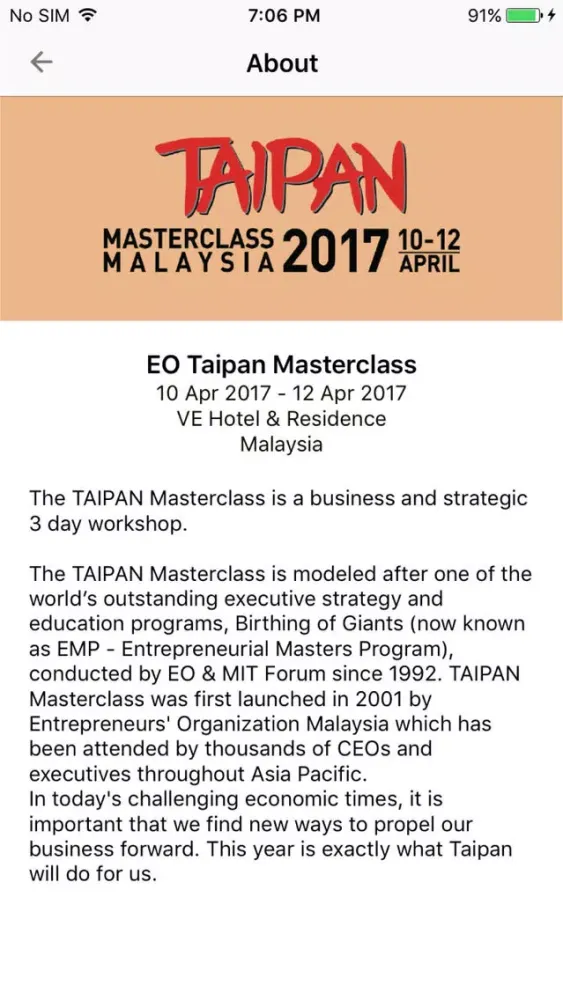 The TAIPAN Masterclass is modeled after one of the world's outstanding executive strategy and education programs, Birthing of Giants (now known as EMP - Entrepreneurial Masters Program), conducted by EO & MIT Forum since 1992. TAIPAN Masterclass was first launched in 2001 by Entrepreneurs' Organization Malaysia which has been attended by thousands of CEOs and executives throughout Asia Pacific.