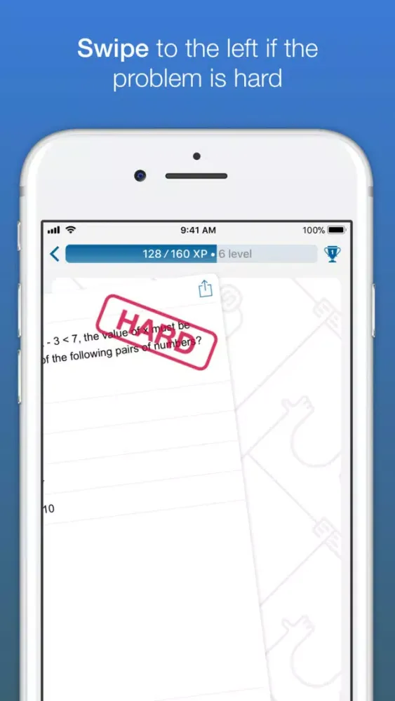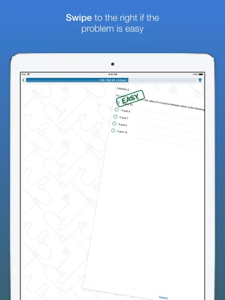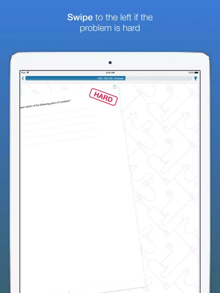 Learning in the app is really simple! If the problem seems too difficult or too easy, you can just swipe the card with the question, the engine will take into account the knowledge level for future content recommendations.
