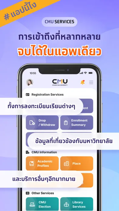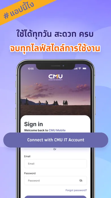 CMU MOBILE เป็น Official application ของมหาวิทยาลัยเชียงใหม่ ที่จะทำให้คุณไม่พลาดการติดตามข่าวสารและกิจกรรมของมหาวิทยาลัย และยังเป็น Application portal ที่ยังเชื่อมต่อไปยังบริการต่างๆของมหาวิทยาลัยเชียงใหม่