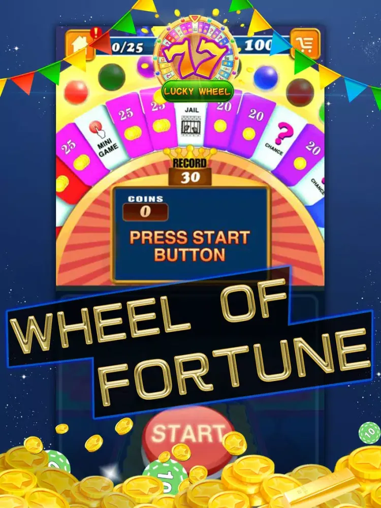 Style of board game. Move the token to travel around the world, own all spaces of cities to win massive collection of coins in the extra wheel of fortune.