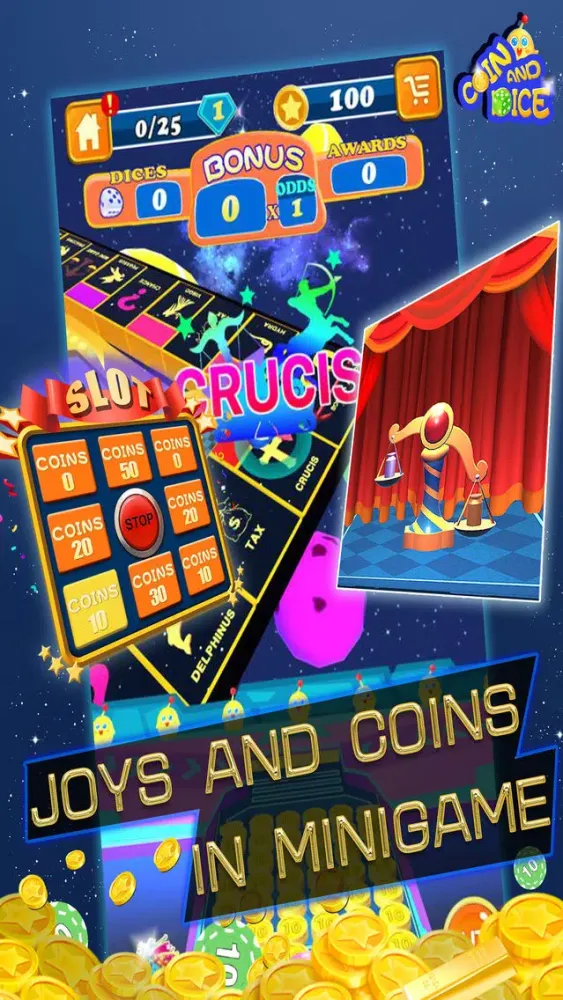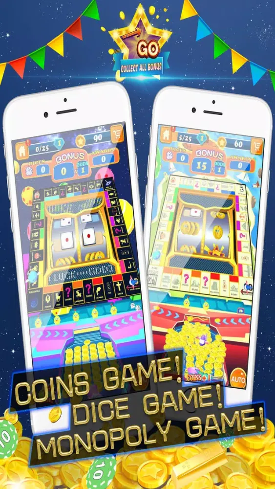 COIN AND DICE combines medal pusher game with board game. Get lucky in game, enjoy premium 3D graphic quality and sound effects!