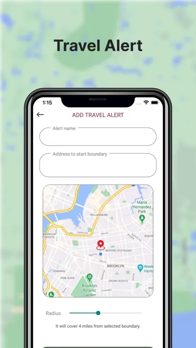 An extra feature provides the geo-fencing(i.e., set a boundary up to 10 miles) that will alert the user to receive a push notification when the member enters or leave the geofenced AREA.