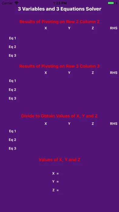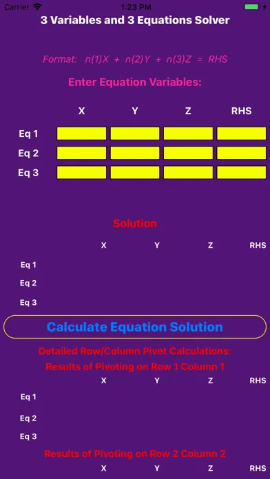 Especially designed for you Math lovers! Solve3Var3Eq is a matrix based app that helps solve problems consisting of 3 equations and 3 variables stated in the following format where n and RHS are numerical values: