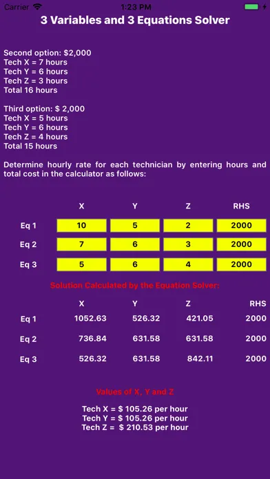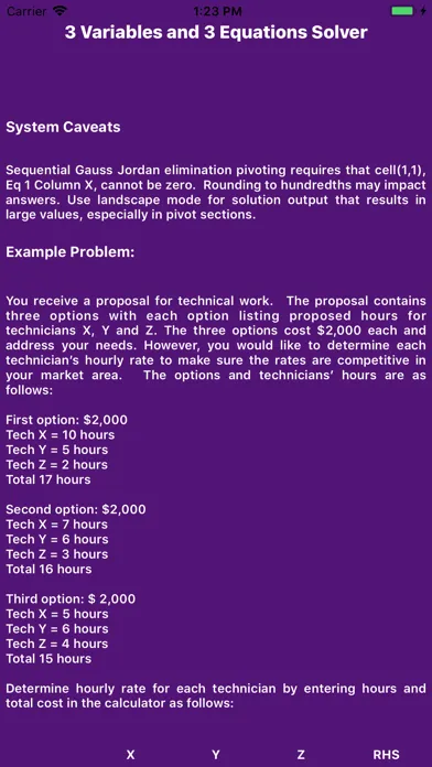 Due to space limitations, Solve3Var3Eq excludes comma number separators. In addition, large numbers, especially in pivot table calculations, may exceed available cell size and may be truncated for visual presentation. In some instances where zero is either the divisor or dividend, the result may be an unsolvable equation. In addition, the app rounds to 2 decimal places which may have an impact on your answers. Please note that the app has been designed for educational purposes only. We hope you enjoy Solve3Var3Eq and are open to any constructive comments for improvements. Enjoy!