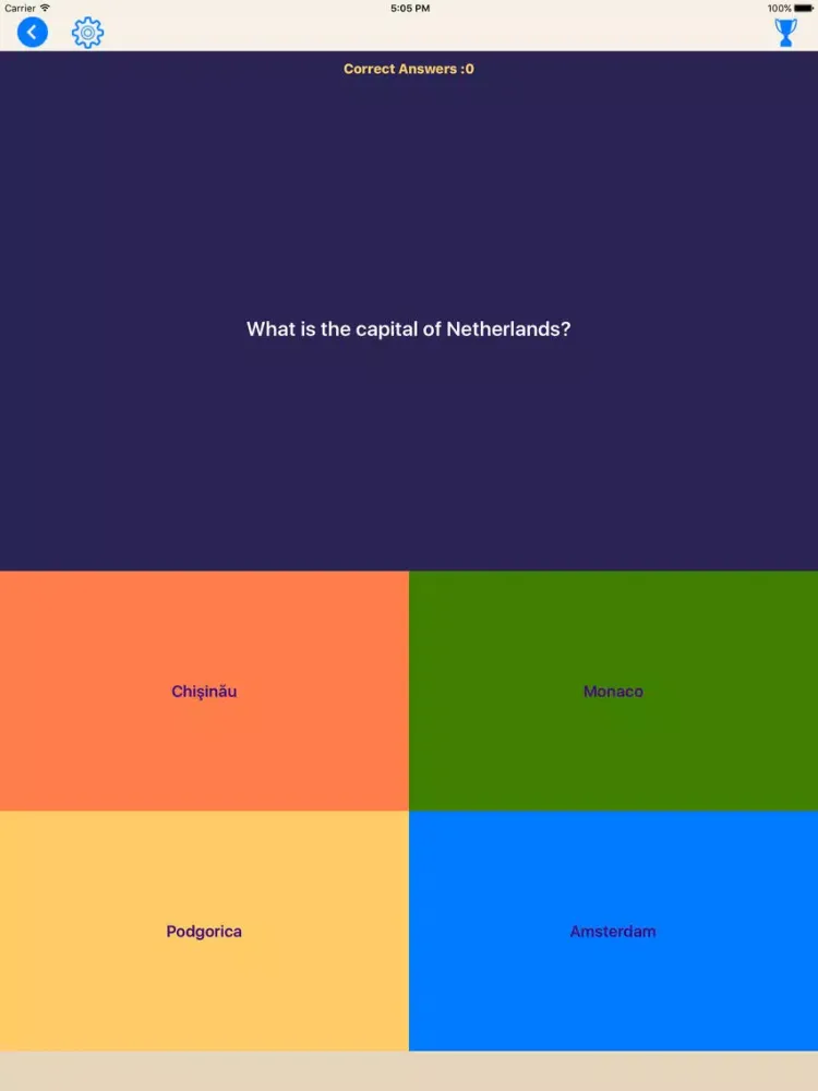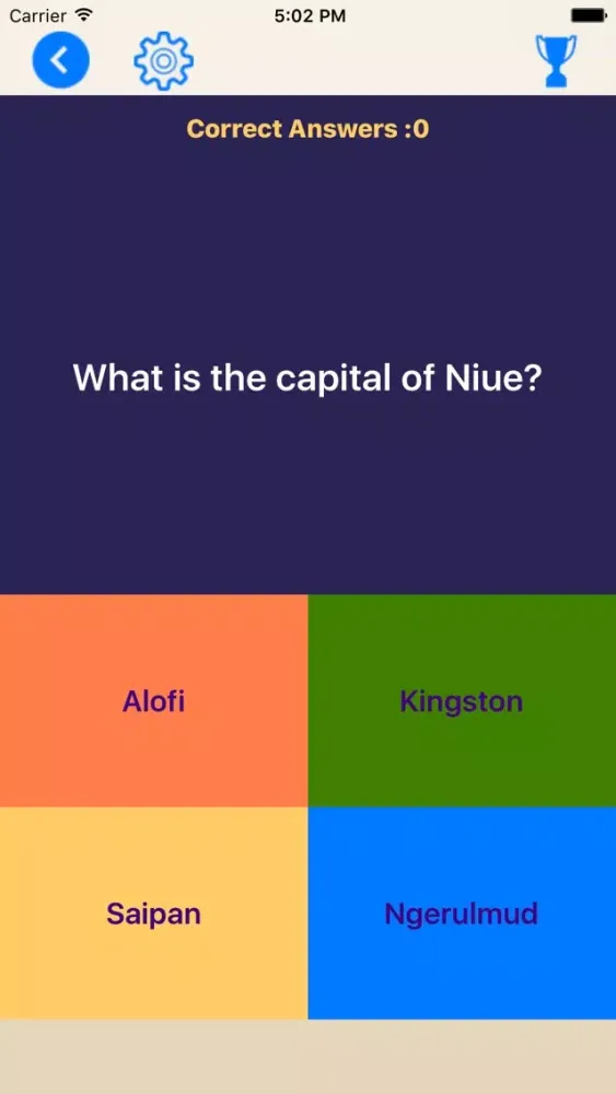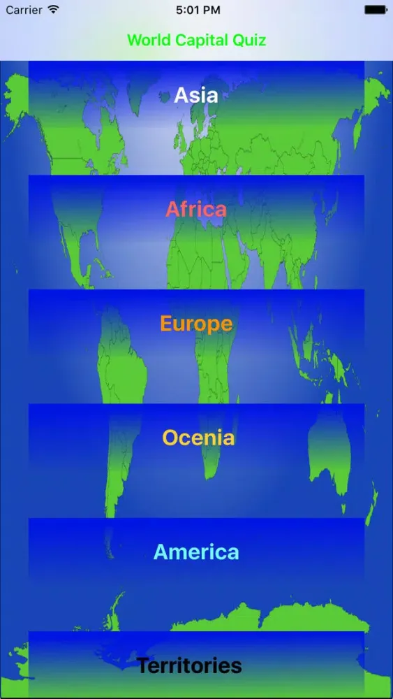 This app has pretty simple and user friendly interface. This app has 6 sections based on continents. One question per country and app user can easily select the section and play the quiz.
