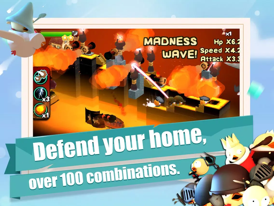 All you need to do is simple: rotate the map, put electric towers, crossbows and other weapons onto the grids you like and enjoy the battle with crazy and funny Chicken Expendables!