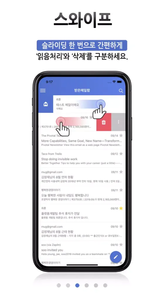 - 좌우 슬라이딩으로 메일 리스트에서 바로 읽음 / 안읽음, 삭제처리가 가능합니다.