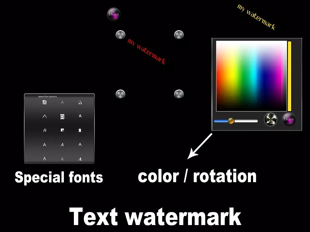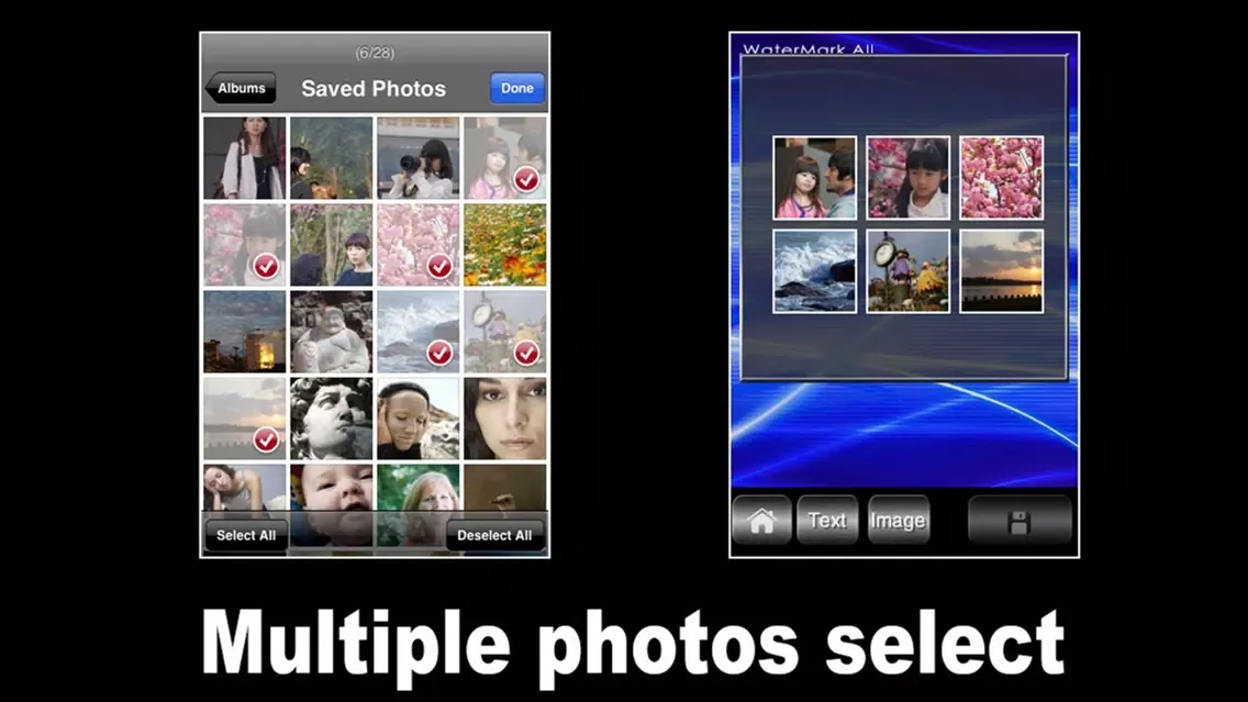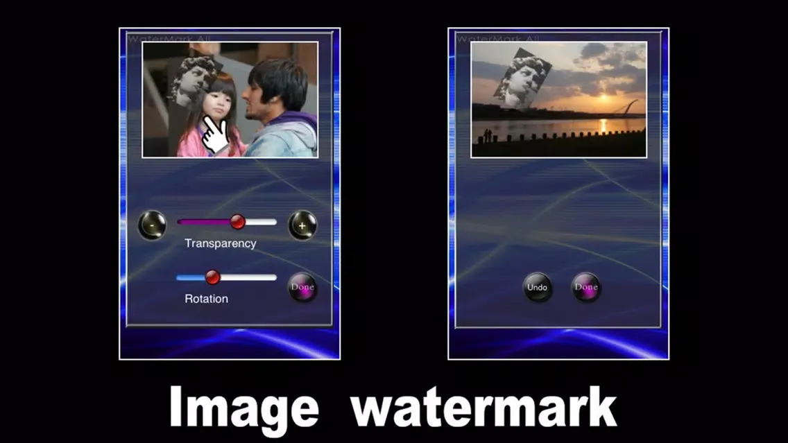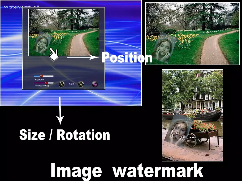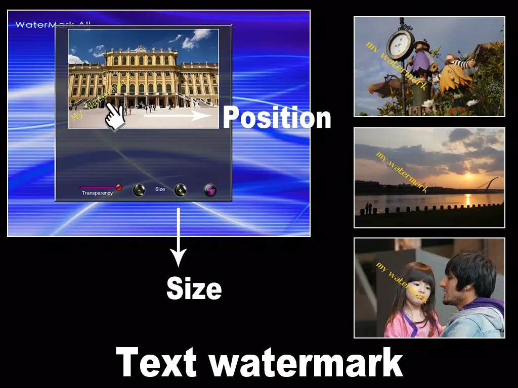 [Watermark All] allow you to make watermark into your photos in batch processing. You can make text watermark or image watermark easily.