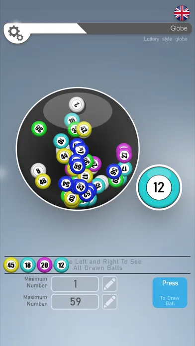 Simulate a globe with bouncing balls. Press the button to draw one ball and see all previously drawn balls. Ideal for Keno, Bingo, Lotto, or Lottery.