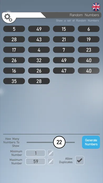 Display up to 32 random numbers within your chosen range (0 to 99999). Option to allow duplicates.